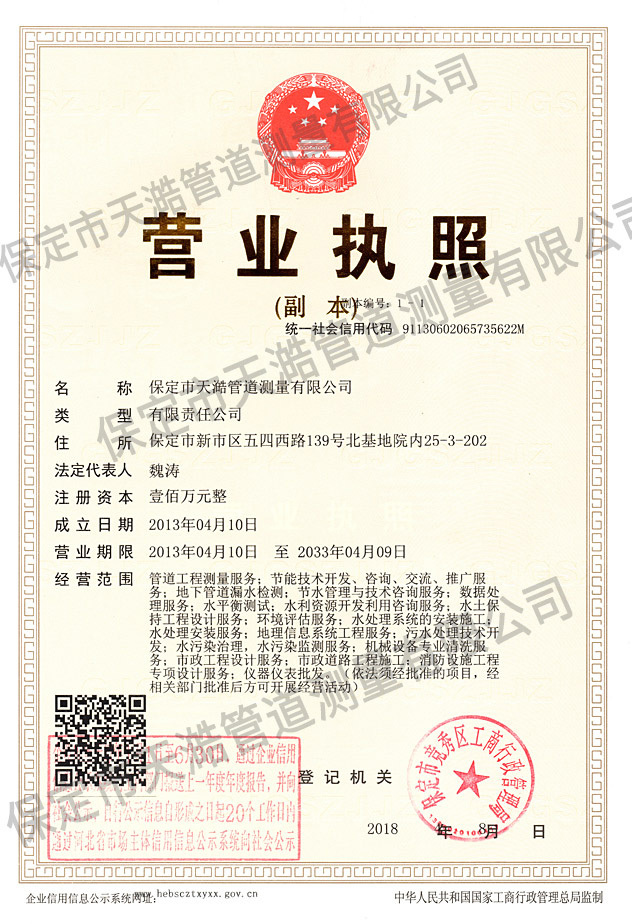 保定市天澔管道測量有限公司主營業務:水平衡測試、漏水檢測、水土保持方案、水資源論證等,歡迎來電咨詢!